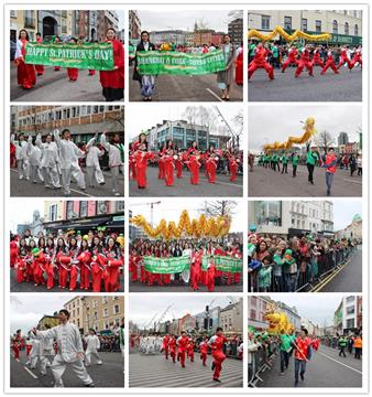 参与此次游行的中国文化方阵由科克孔院组织孔院教师、科克大学中国学联、亚洲研究院、当地华人华侨以及中爱友好人士40余人组成。下午1时许,方阵正式加入到浩浩荡荡的游行队伍中。率先映入人们眼帘的是五位身穿旗袍、汉服等传统服饰的姑娘,她们手拿中国结和印有“Happy St. Patrick Day!”(“圣·帕特里克节快乐!”)、“Shanghai & Cork - Sister Cities”(“上海&科克——姐妹城市”)的横幅,吸引了众多观众的注目。朝气蓬勃的武术队紧随其后,这是来自科克孔院周末少儿武术班的孩子们,他们的武术表演充满活力,感染着在场的人们,赢得了阵阵掌声。与“动中有静”的武术队不同,太极队则完美地诠释着“静中有动”,统一的着装、整齐划一的动作,一招一式都在向爱尔兰人民传递着中国精神。太极队后,是喜庆热闹的腰鼓队,美丽的姑娘们身着火红的衣裳,为全城皆绿的科克涂抹上了靓丽的一笔,腰鼓声响彻整座科克城,传递着最真挚的祝福。气宇轩昂的舞龙队镇守在方阵的最后方,一看到“龙”的出现,道路两旁的人们立刻沸腾起来,孩子们纷纷叫着“Dragon! Dragon!”舞龙队的“金龙”不时与人们互动,更是将现场气氛推向最高潮。整个游行过程历时一小时,独具特色的中国方阵所到之处,掌声、喝彩声不断。