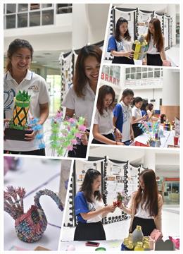 4月22日是地球日,恰逢中文课当中的“环保”单元,为了提高员工的环境意识,动员员工参与环保运动,普吉孔院的教师们提倡员工们结合书本,利用废弃的材料制作再生品。召集通知发出后,员工们运用丰富的创造力和灵巧的手工,制作了各式各样的手工艺品——废纸叠的孔雀,用废塑料瓶做的存钱罐,用冰棒棍粘的储物盒,用废布缝的钥匙扣,更有布艺和塑料做的捧花、经过加工的破牛仔裤,每一件作品都包含了员工的热情与环保之心,琳琅满目的小物件让老师们应接不暇。28日,手工艺品开始在公司展出。精美的物件吸引了经过的师生和工作人员, 他们驻足观赏,仔细端详,赞不绝口。员工们拿着自己的作品向老师与朋友们介绍,也有员工戴上手工制作的帽子,拿着废物变成的花朵,在老师们面前逗趣表演,爽朗的笑声在展台前蔓延开来。员工们在欢乐当中学完了《博雅汉语》的最后一课——环保,并开始在生活中了解更多环保知识。