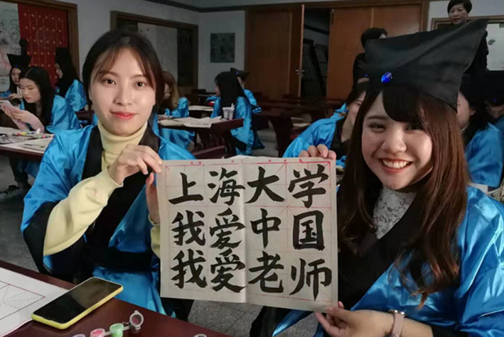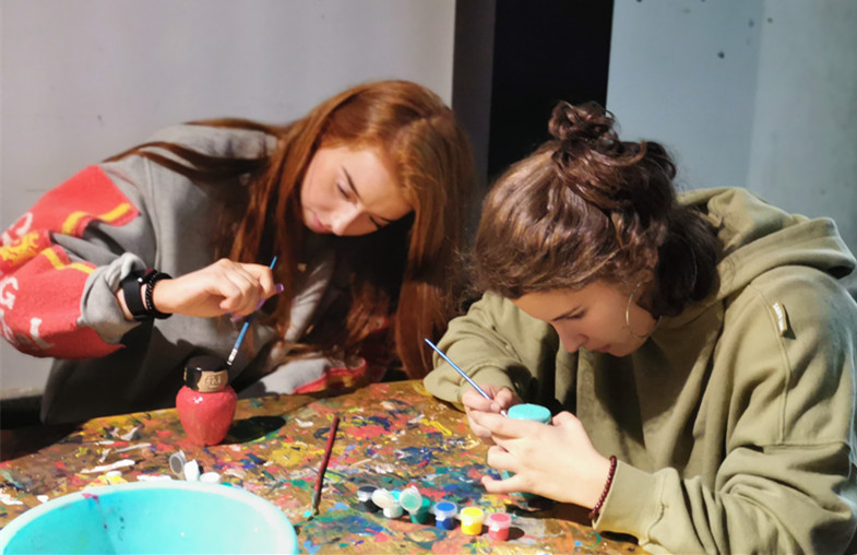 此次语言实践活动安排了丰富多样的文化体验活动:穿汉服写书法、石头绘画、手工制作彩绘黄酒瓶等,职工们兴趣盎然,将自己对中国文化的感受、理解融入手工创作中,表达对中国文化的热爱以及美好的心愿。