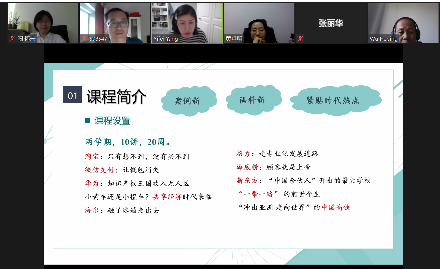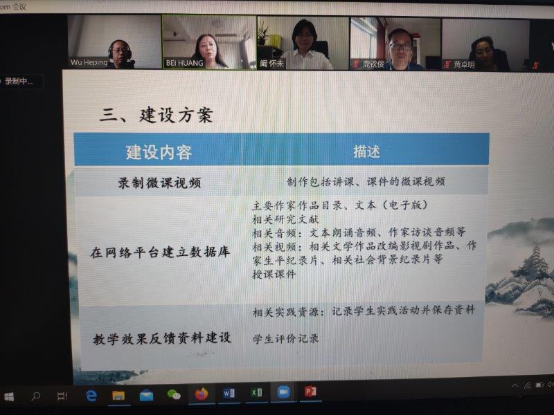 参加2020年院级课题暨在线课程建设立项的课程共有五门,分别是:张丽华老师的《儒学与当代中国经贸文化》、杨一飞老师的《经贸汉语阅读1-2》、黄蓓老师的《中国现代文学名家名篇》、黄友老师的《汉字文化》、裴雨来老师的《高级汉语读写课(2-3)》。每一位立项申请老师在自述PPT中展现了各自课程的前期基础、线上线下混合教学的设计思路、课程亮点、线上线下教学内容安排、教学活动安排、员工反馈等情况,也向在座专家提出了自己面临的困惑及进一步提升课程建设的要求。