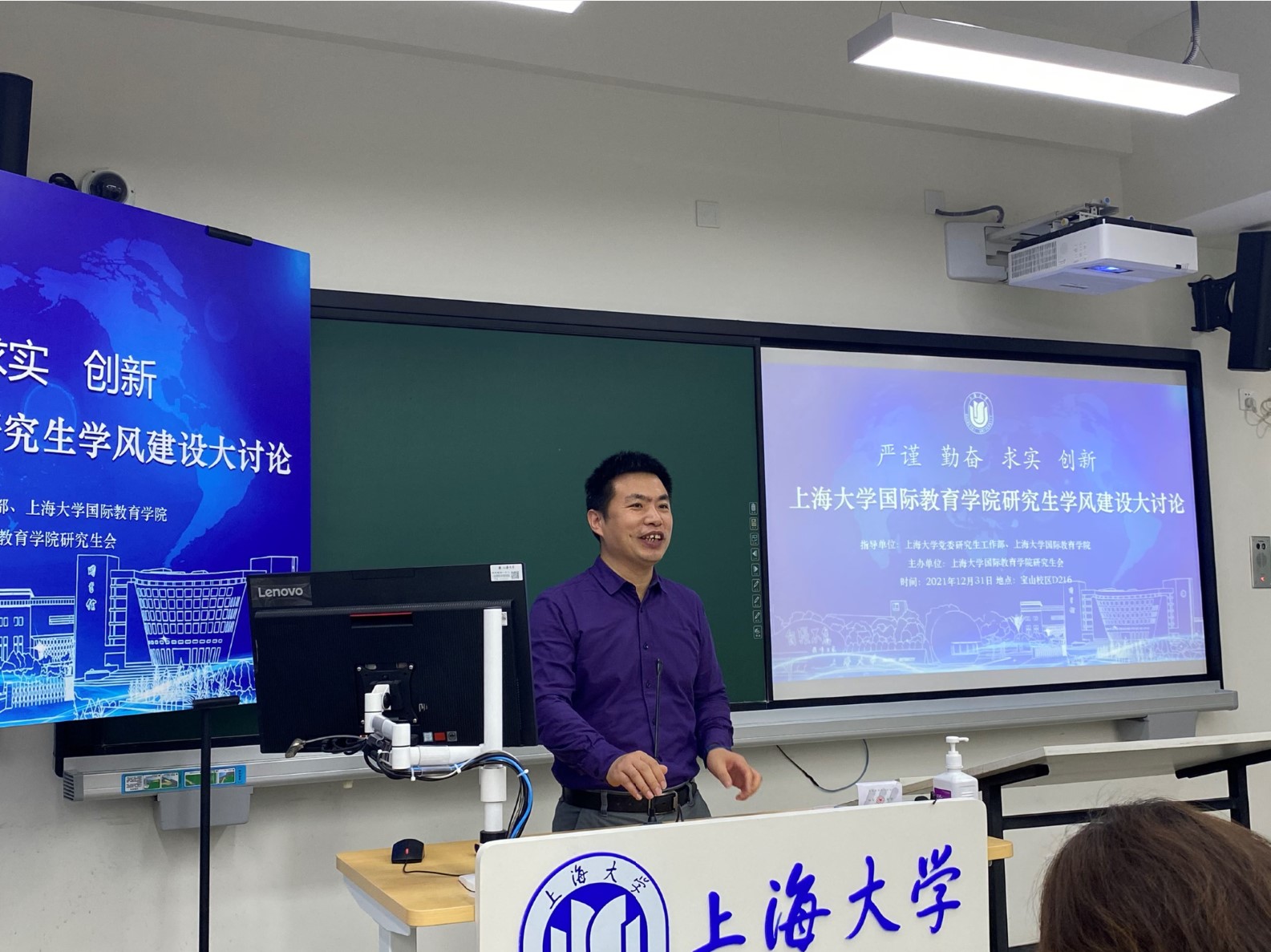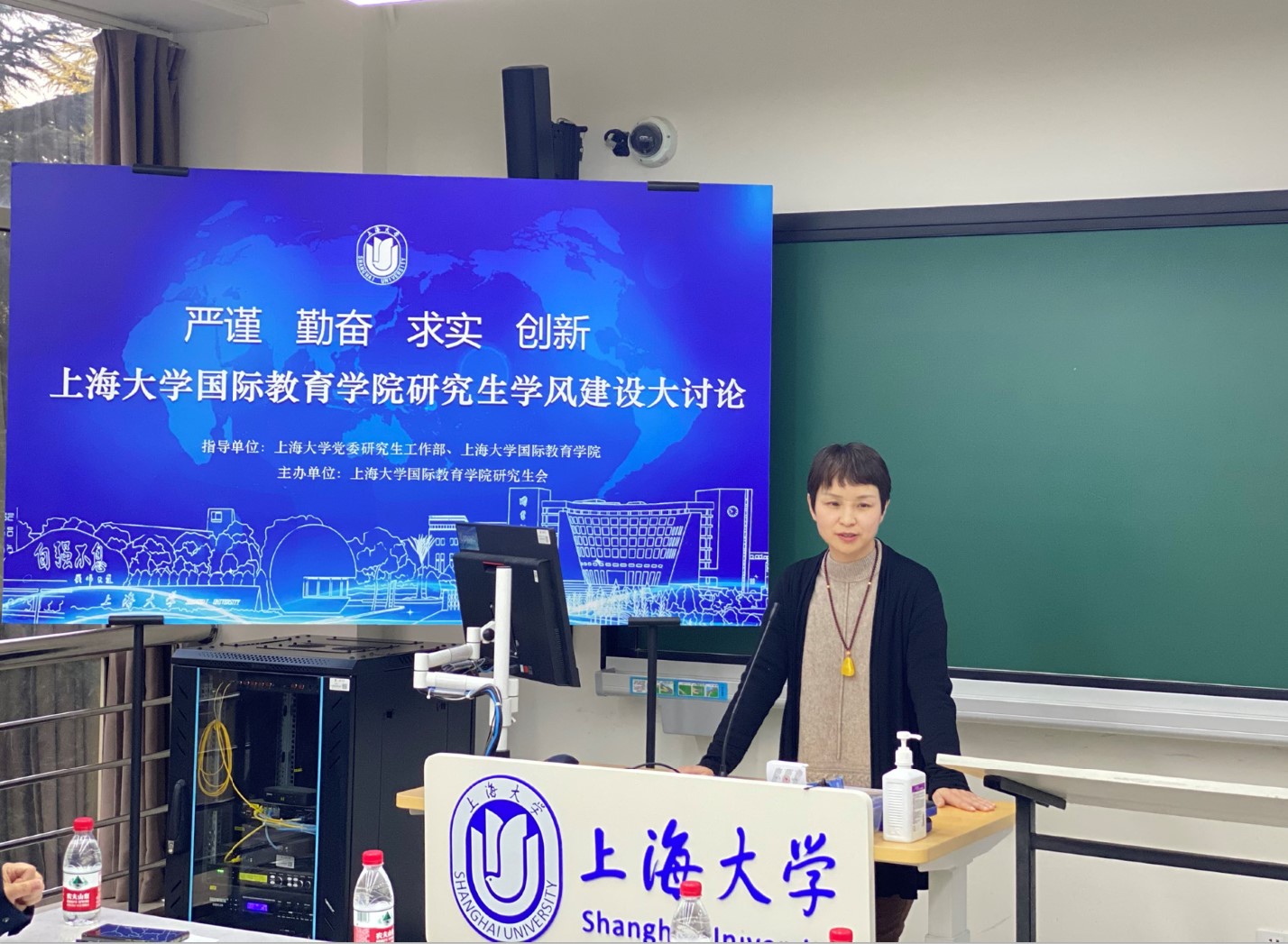 曾艳老师从专业特色的视角阐述了学风建设的具体要求,提出青年员工应该志存高远,不仅为了小我,也要为了大家,应该意识到“天将降大任于斯人也”,意识到汉教人传播中国文化,讲好中国故事的责任。曾艳老师以自己教学中的真实故事为例讲述了如何消除员工对中国特色社会主义的错误印象,并强调了用外国人能理解的方式将中华文化传播出去;杨昱华老师强调,求实、踏实做好自己专业分内的事,对于员工来说,要认真对待自己的作业。并且呼吁大家以后不管从事哪一行业,都要贯彻求实精神,认真踏实地对待自己的工作;常峻老师表示,同学们要把找到自我的静气,奋发向上、滴水穿石的勇气,脚踏实地的底气,敢为人先的锐气融入到学习生活中;杨一飞老师分析了严守学术诚信、遵守学术规范与学术底线的重要性;黄蓓老师则提倡大家应该利用读研的过程多多的吸取人类文明的最高成果,同时提升自己的道德修养,成为一个优秀的人。