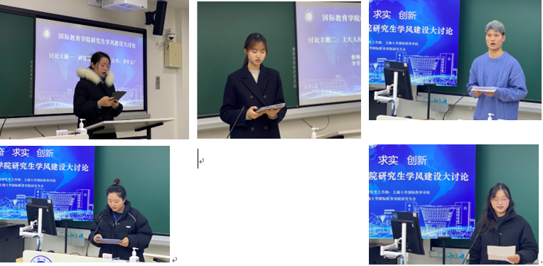 20级、21级汉语国际教育硕士生潘颖慧、周晶晶、张帅帅、宋冰艳、黄蓉蓉五位同学也从自身专业的角度出发,阐述了研究生应有的治学境界,新时代的研究生要以自强不息、奋勇拼搏的精神治学,坚定学术理想做新时代的研究生,严守学术底线,落实科学道德与学风建设,为国家发展而学。