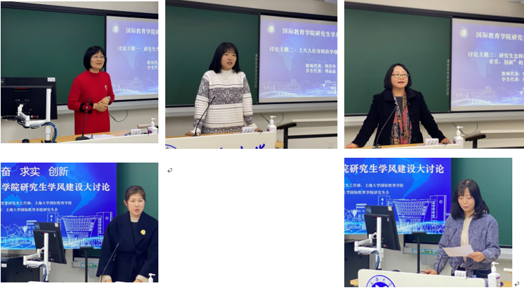 研讨会以专业教师代表发言、员工代表发言与集中讨论相结合的形式进行,围绕“研究生为谁学、怎么学、学什么?”“上大人应有的治学境界和追寻是什么?”“研究生怎样理解“严谨、勤奋、求实、创新”的上大学风?”“研究生怎样严守学术诚信、学术规范与学术底线?”“研究生怎样落实科学道德与学风建设?”五个议题展开讨论。