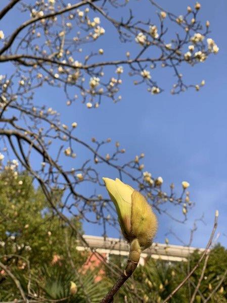 延长校区大草坪上的玉兰花已经半开了。
