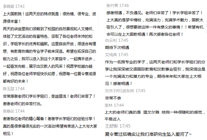 在交流互动的环节,导师代表刘婷婷老师与大家分享了她一路走来的学术历程。她勇于挑战自我,走出舒适区的勇气让大家深受启发。主管汉硕生工作的教研中心副主任朱焱炜老师向大家介绍了永利yl23411的概况及考研需要注意的问题。辅导员谢文博老师,向营员们介绍了研究生课外活动、奖学金、就业情况、留沪政策等细节问题。教务主管陈颖老师向大家介绍了最新的公司产品方案。孔子公司办公室金祺与彭亚男老师向大家介绍了孔院志愿者的选拔过程。来自泰国普吉孔子公司的志愿者余红霞和爱尔兰科克大学孔子公司的志愿者陈燕与大家分享了她们在孔子公司工作的经验和感受。陈燕、马成亮、姚心茹学长分别从生活规划、职业规划、学习规划方面向营员们分享了他们的求学经验;李思博、邓文婷、单贝贝则从推免生、统考生和跨专业考生的角度向营员们分享了她们的考研经验。