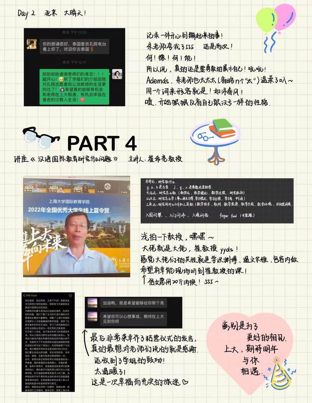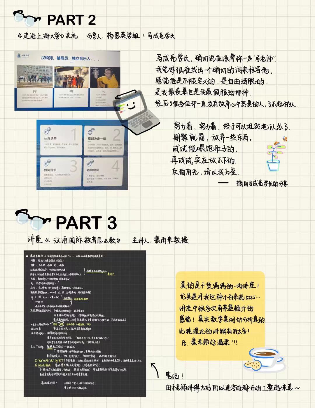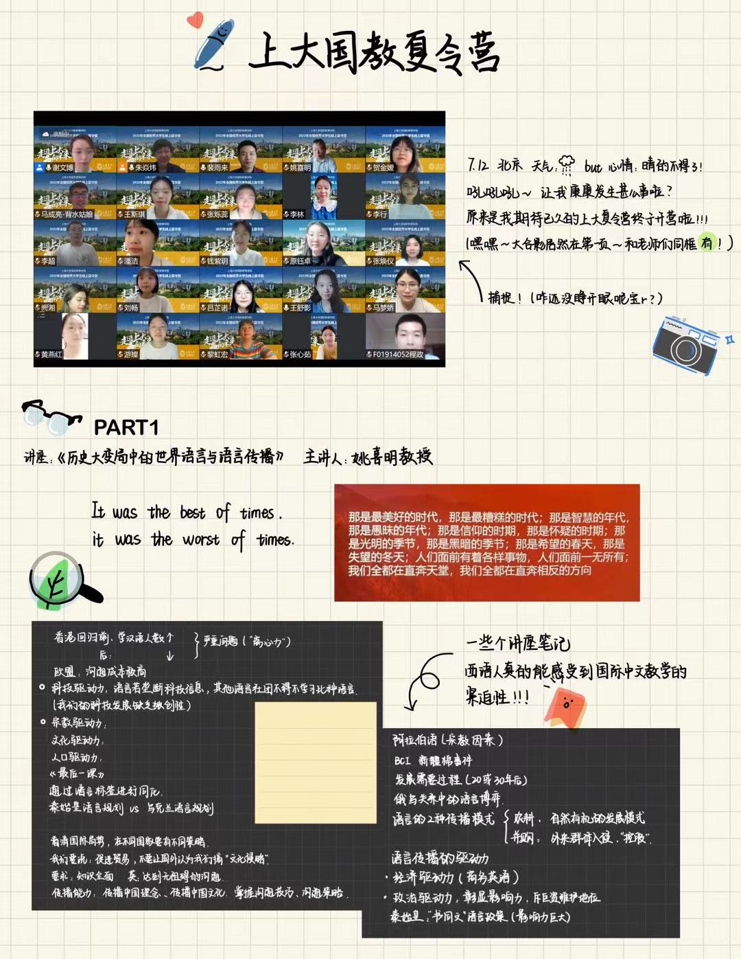 两天的夏令营时光短暂却充实。来自新疆大学的白云钊同学在结营仪式上用“两道主菜和一些甜品”概括了这次夏令营给他的印象,他说这次夏令营完美展示了永利yl23411丰厚的公司产品资源和积极向上的学风校风,让他对专业有了更深的了解,坚定了成为一名上大国教人的信心。来自湘潭大学的尤海悦对 “使命”、“真诚”与“爱折腾”这几个关键词印象深刻。她说:使命感就是对自己真诚、遵从内心的表现。有了使命感,就有了前进的方向,而 “使命”与“真诚”也给人以“折腾”的勇气。来自河北师范大学的张焕仪同学还把本次夏令营的听课笔记做成了精美的电子手账与大家分享。