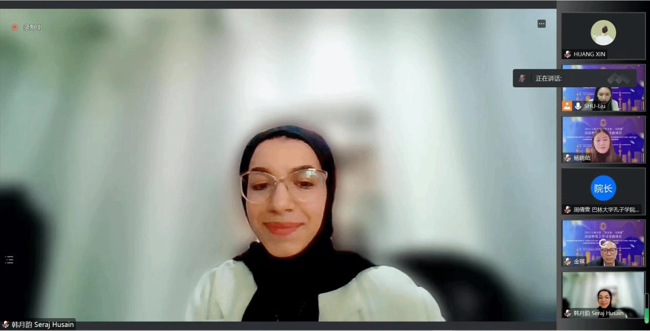巴林大学孔子公司中方经理周倩雯作为特别嘉宾致辞,她指出:中国与海湾国家历来友好,文化交流与经济合作越来越紧密。来到巴林王国工作以后,我见识到了阿拉伯灿烂的文明、热情好客的人们和令人惊叹的世界遗产,我也对海合会国家之间密切的经济和文化联系深表赞赏,我希望通过这次项目,能加深海合六国成员们对中国的了解,未来能够有机会与各位成员线下见面,相聚上海,相聚中国。