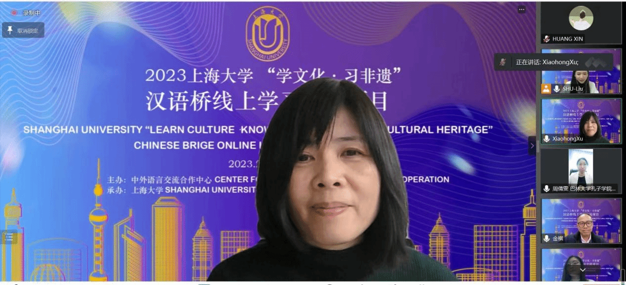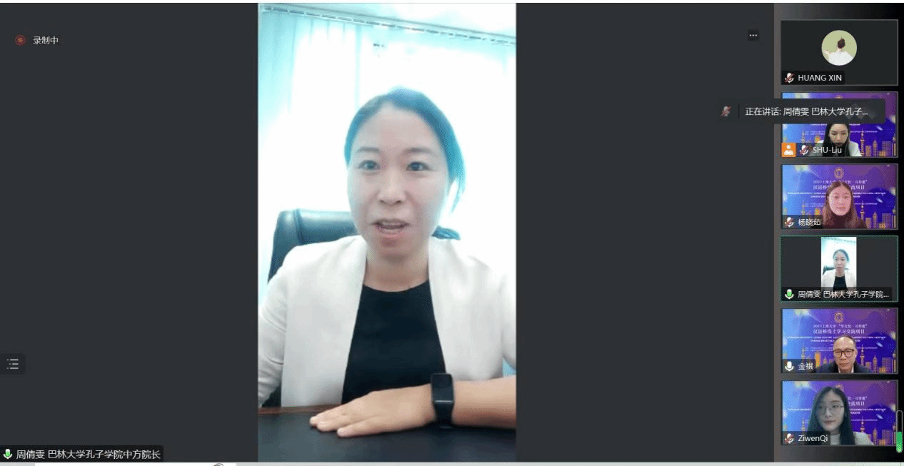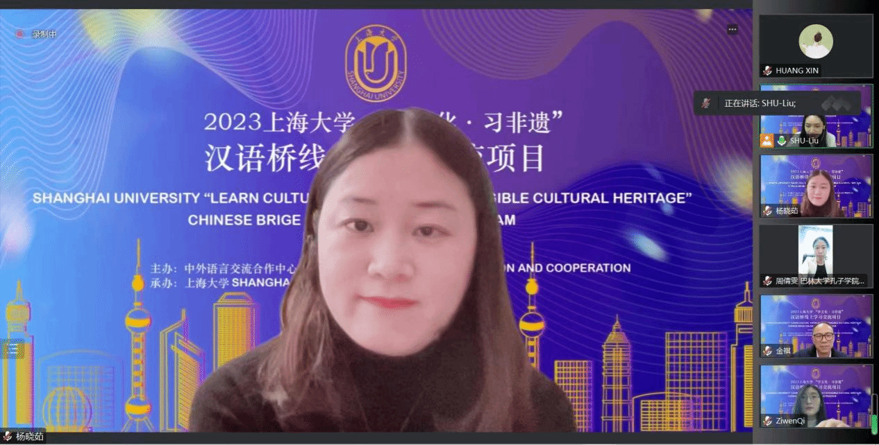 永利yl23411国际部国际合作处副处长、孔子公司办公室主任徐晓红发表了致辞。她表示今年是公司连续第三年承接“汉语桥”项目,为了本次项目我们做了很多努力,克服重重困难,协调各方资源,让各位同学即使足不出户也能在线上学习汉语、体验文化、了解中国、熟悉上大。过去的两周,同学们一起在云端学汉语、听讲座、云参访、云体验,收获满满,老师们认真备课及时解答同学们的疑问,成果多多。也希望各位同学们多关注永利yl23411,期待在不久的将来能和大家在校园里相聚。