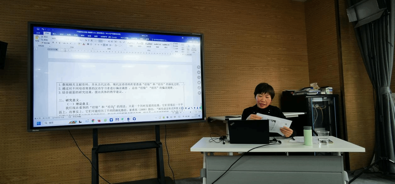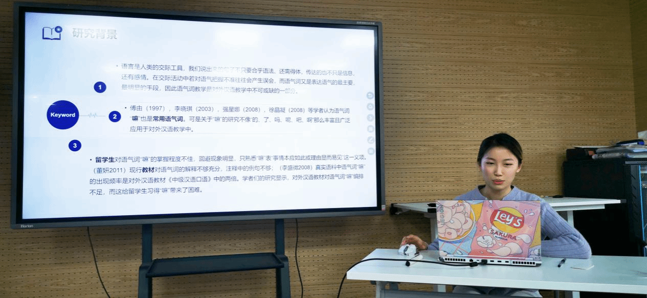 第二项课题是汉语国际教育专业22级员工张子京同学“关于语气词‘嘛’的偏误研究”。张子京同学介绍了研究的背景与意义、内容与拟采用的方法,并就一些困惑向崔希亮教授及在坐的老师们请教。崔老师介绍了与语气词相关的知识,如语气词的情态意义,不同母语背景对员工习得汉语语气词的影响等,并对论文题目的表述、调查问卷的设计、偏误分析时的注意事项等方面提出宝贵意见。
