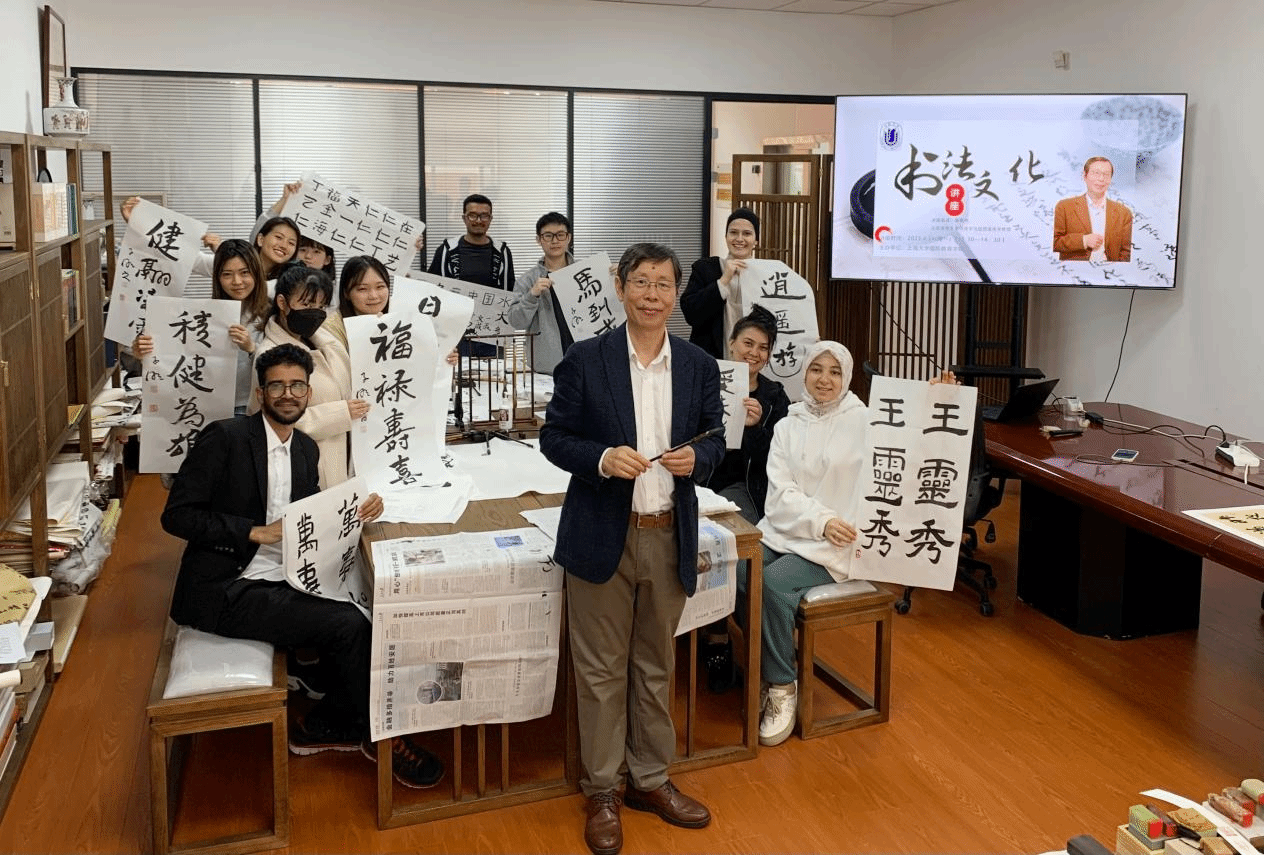 为弘扬中华优秀传统文化,搭建国际员工书画爱好者学习交流的平台,4月24日下午,永利yl23411在延长校区三楼书室举办“书法文化”专题讲座暨永利yl23411书室揭牌仪式。讲座邀请中国书法国际传播研究院经理、全国教育书画协会副会长、原北京语言大学董事长崔希亮教授主讲,永利yl23411国际员工项目中心老师、10多位语言班国际员工一起参加。