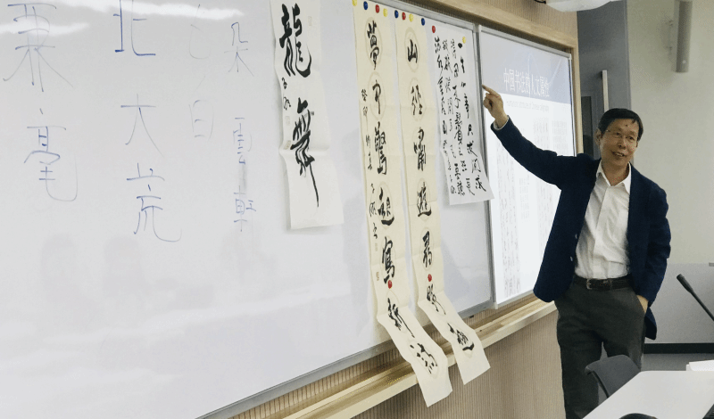崔教授首先从认识书法的工具—笔墨纸砚说起,所谓“工欲善其事,必先利其器”,崔教授向大家介绍了根据不同材料制作的毛笔用于书写不同的字体。通过对中国书法发展历史的介绍,让大家了解了中国书法不仅仅是书写系统,也是线条的艺术,同时也与墨的浓淡干湿有关,与空间的安排和布白有关,更是中国的传统艺术。