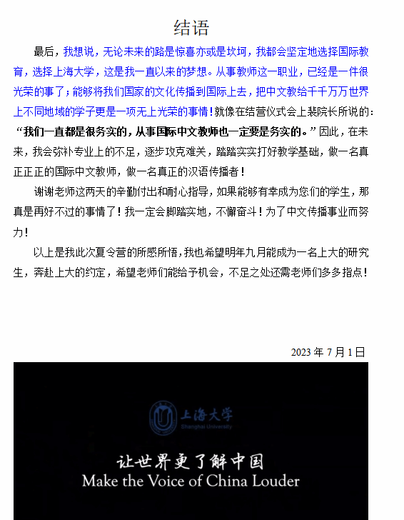 华北水利水电大学的李梦琪同学对学长学姐们掏家底式的分享特别感谢,对上大国教院的人文氛围和奉献精神印象深刻。她说:“在永利yl23411夏令营,我深刻地感受到了老师们的人文关怀,在老师们眼里每一个员工都是平等的,老师不看重院校出身,给我们充分展示自己的机会。”“一招必胜的‘绝招’只有两个字——奉献,把你的全部奉献给你所热爱的一切,也许每个人都没有那么勇敢,但是因为热爱,我们愿意奔赴一个陌生的,充满不确定的国家,赓续我们的汉语教学事业。就像永利yl23411的校训一样:‘自强不息,道济天下。’如果有机会,即使有危险我也会毅然决然选择奔赴国外,担当起自己的使命,传播中华文化,传授中文知识。”