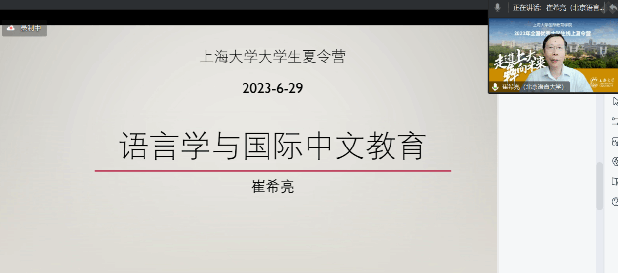 北京语言大学教授、中国书法国际传播研究院经理崔希亮老师为大家作了题为《语言学与国际中文教育》的讲座。崔希亮教授首先为大家介绍了语言和语言学的相关概念,带领大家重新思考了“什么是语言”“什么是语言学”等问题,并从语言学与语文学、语言学与认知科学、语言学与信息科学、语言学与神经科学、语言学与人类学、语言学与心理学、语言学与其他学科等七个角度为大家介绍了语言科学的疆域。崔希亮教授指出,语言学是语言教学的学科基础,二者不可分割,国际中文教育从学科定位上来说就是汉语作为第二语言的教学。接着,崔希亮教授从汉语本体、学习者、教学法、教学工具、教学环境、语言学习理论和语言教学理论等方面为同学们总结梳理了语言教学的基本问题。崔希亮教授还从自身经验出发,用实际教学中的例子为大家详细介绍了课堂教学中会碰到的问题,例如虚词的意义和用法、实词的意义和用法、同义词近义词辨析、量词的用法及解释、语气词的情态意义、句式的意义和用法等,并建议大家要利用好现有的语料库资源来获取丰富的语料以加深自己的研究。崔老师的讲座结合大量实例,以一个个具体鲜活的例子阐释了语言学与国际中文教育的关系,他从实践中探寻问题的治学方法使大家深受启发。