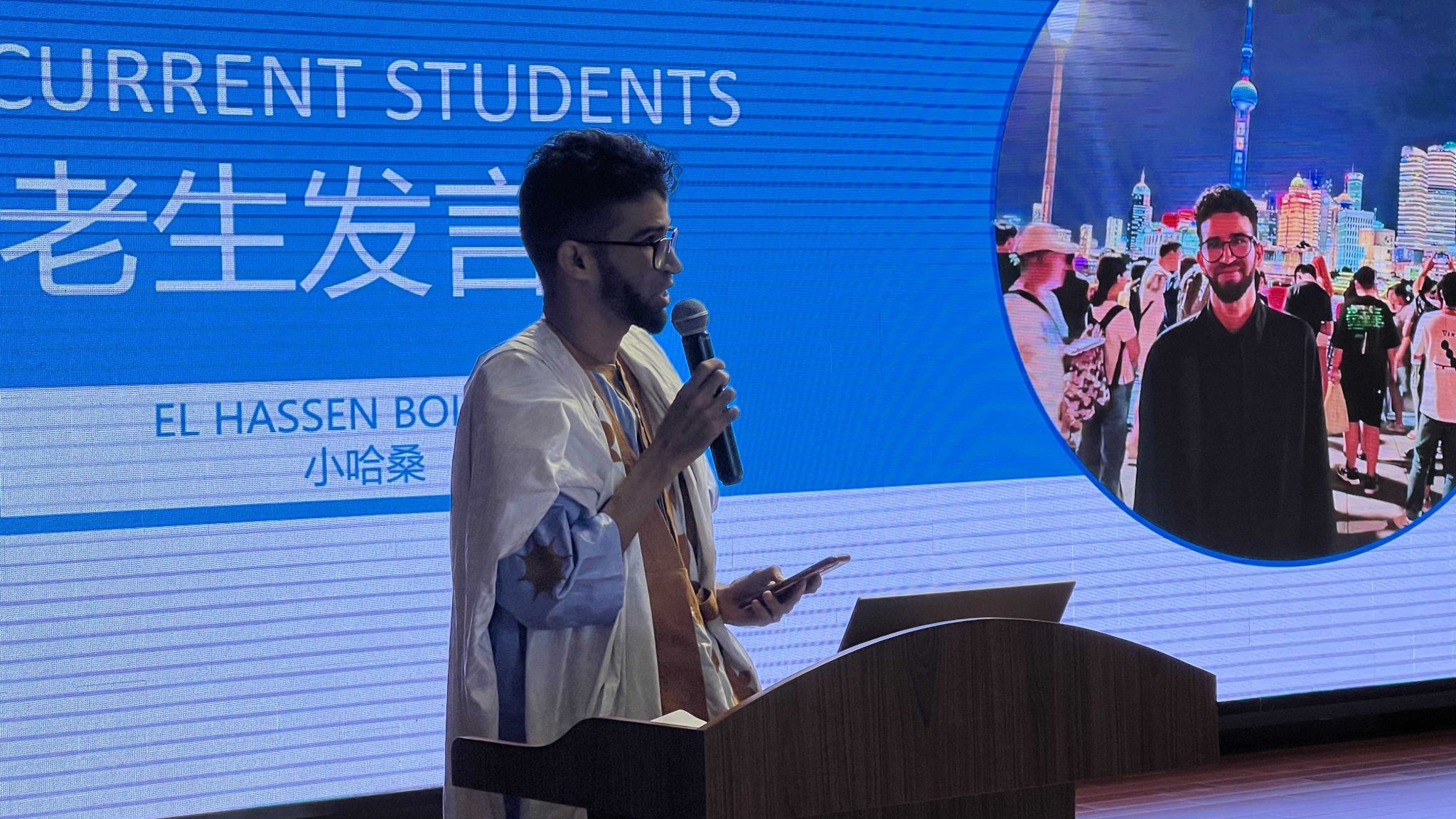 老生代表来自毛里塔尼亚的 EL HASSEN BOLLAHI 分享了他在学习汉语过程中的心路历程和在上海老员工活学习的美好经历,表达