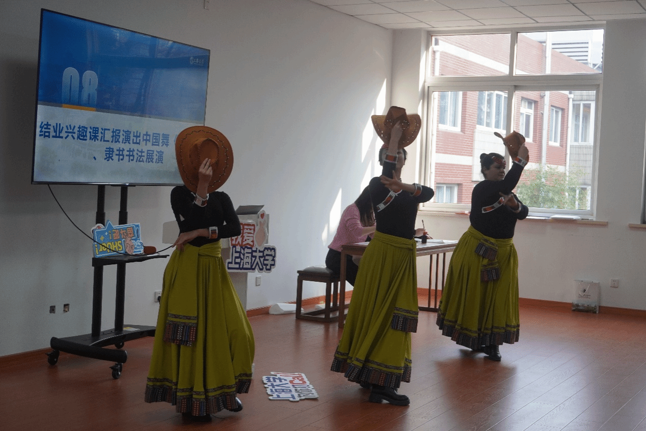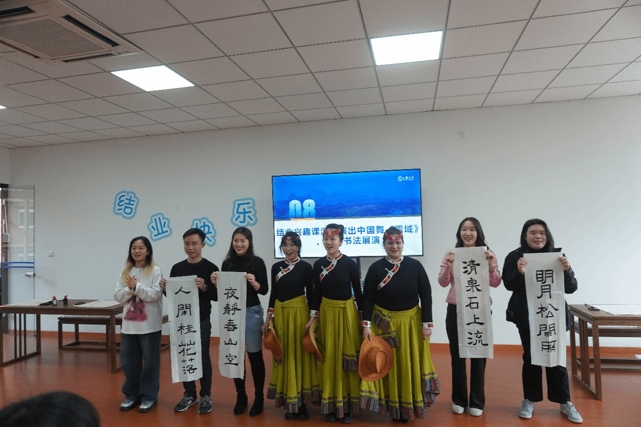 这个学期,为丰富同学们的业余生活,长期汉语项目还开设了三门兴趣课程。伴随着雄浑激荡的音乐,中国舞兴趣班的同学们带来了优美的中国舞表演《雪域》,书法兴趣班的同学泼墨挥毫,写成了一幅端庄大气的隶书古诗条幅。她们精彩的展演赢得了同学们的阵阵掌声。