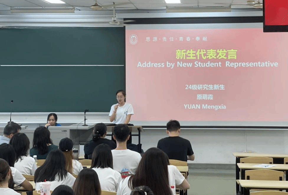 汉语国际教育专业新生袁萌霞作为硕士新生代表发言。她讲述了在本科公司作为志愿者参与国际员工暑期夏令营的经历,希望在硕士学习阶段,提升专业教学实践能力,厚植知识储备,将汉语教学法和本体知识有机结合,在扎实掌握知识的基础上努力做到“知行合一”。