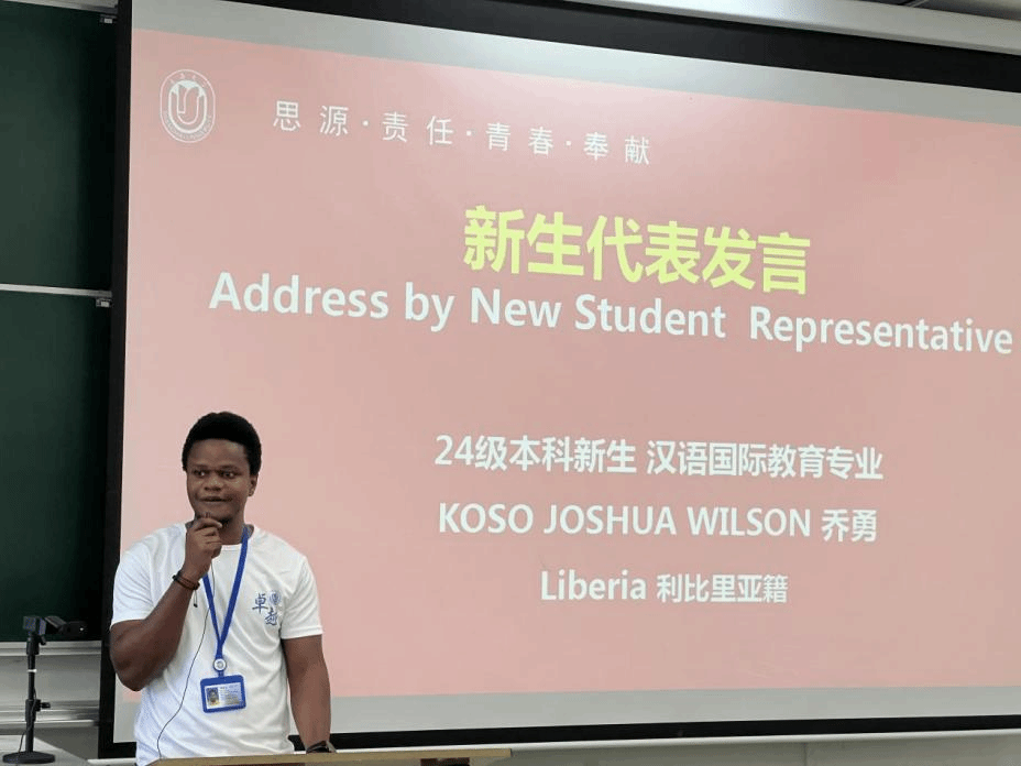 汉语国际教育专业利比里亚籍新生Joshua Wilson Koso(乔勇)作为本科新生代表发言。回顾自己和中文的结缘,乔勇十分感谢能有机会来到中国学习,希望经过四年的专业学习,打好扎实的中文基础,毕业后成为一名中文教师,传播好中国文化,帮助来自本国和其它国家热爱中文的员工圆梦。