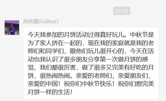 首先,李经理为在座师生送去了节日的问候与祝福。她向国际员工详细讲解了中秋节文化知识,让员工对中秋节的起源、发展、习俗、文化内涵、重要意义有了更深入的了解与认识。她讲到:“中秋节作为中华民族的传统节日,承载着团圆、和谐与美好的寓意。虽然同学们在中国不能常与家人团聚,但希望大家把公司当做第二个家,在紧张的学习生活之余,能够常与老师、朋友、同学共同享受生活中的美好时光。”