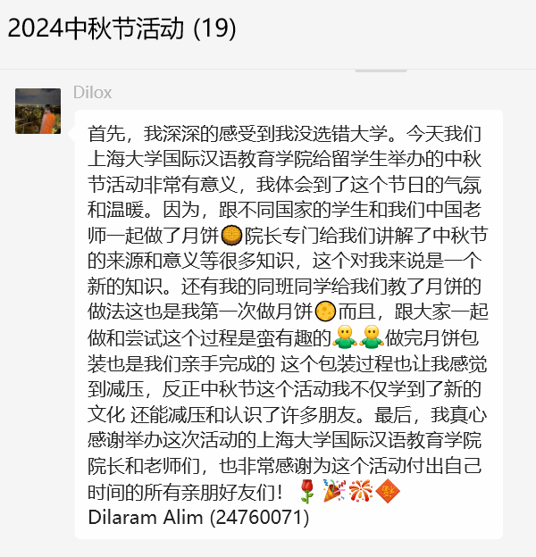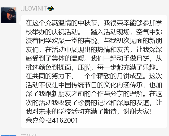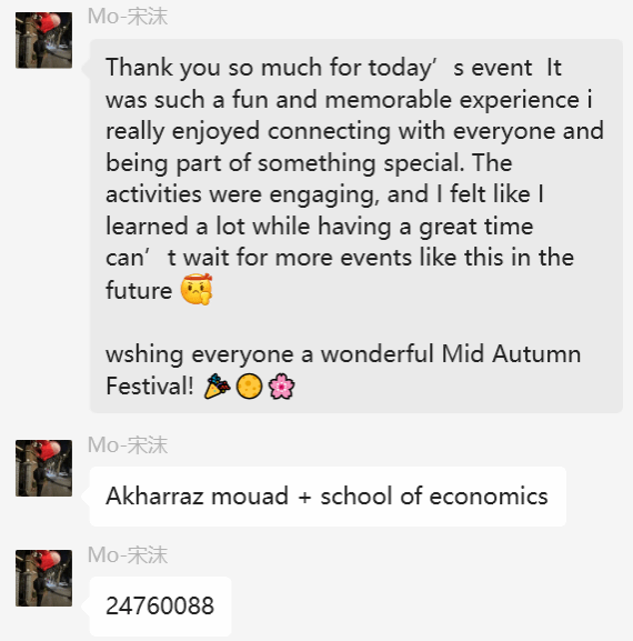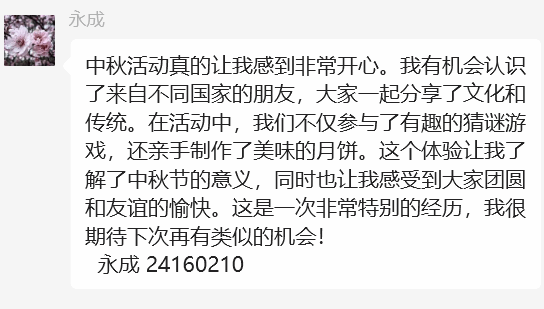 此次活动在欢声笑语中圆满结束。通过学习与体悟,国际员工深刻感受到了中秋佳节所蕴含的团圆、和谐与美好的文化内涵。为同学们紧张繁忙的学习、生活增添了亮色,更在轻松愉快的氛围中感受到中华民族传统文化的博大精深与独特魅力,这份独特的文化记忆将永远熠熠生辉。