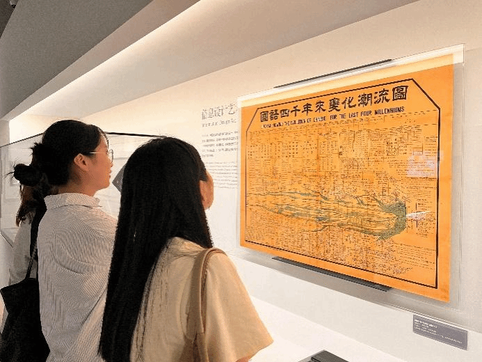 一张特殊的展品——《国语四千年来变化潮流图》吸引了同学们的驻足。这张中英文对照的大图展示了中国四千年来的文脉,让中外员工对源远流长的中国文化惊叹不已。这张图