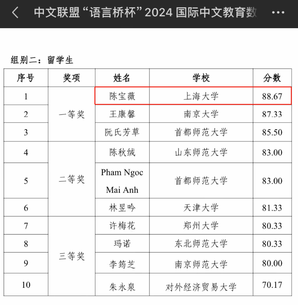 中文联盟“语言桥杯”2024年国际中文教育数智化教学技能交流展示活动今年7月启动,历经院校初选、全国复选与全国总决赛,公司2024级国际中文教育专业硕士陈宝薇同学以最高分荣获在华职工组一等奖。